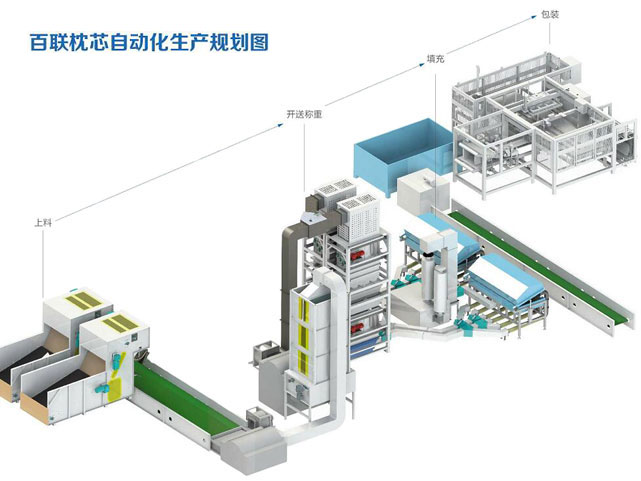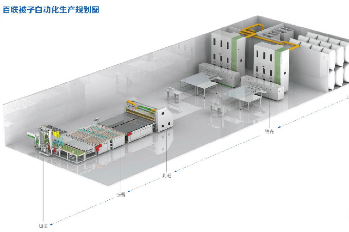 百聯的家紡自動化解決方案,一方面在用工、生產效率、工作環境等方面極大地改善了用戶的生產,另一方面又以精確均勻、蓬松美觀的纖維填充提升了羽絨被、棉被、枕芯等家紡產品的生產品質,滿足了消費市場日益增長的高品質家紡產品需求。