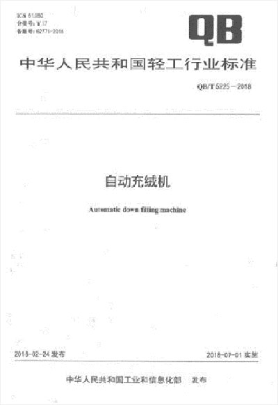 自2018年7月1日起,由百聯(lián)牽頭主起草的編號為QB/T5225-2018 號的“自動充絨機”行業(yè)推薦性標(biāo)準(zhǔn)正式實施了。該標(biāo)準(zhǔn)規(guī)定了自動充絨機的術(shù)語和定義、產(chǎn)品分類、要求、試驗方法、檢驗規(guī)則、標(biāo)志、包裝、運輸和貯存,適用于自動充絨機,其他充填物的類似設(shè)備可參照執(zhí)行。