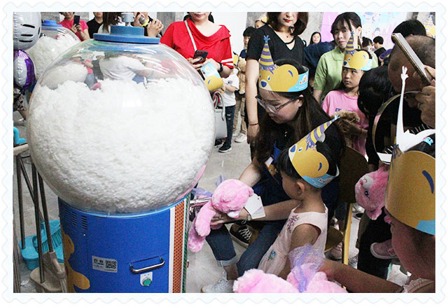 小朋友用爸爸媽媽設(shè)計生產(chǎn)的機(jī)器給玩偶充棉