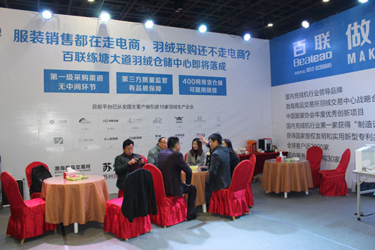 展會(huì)現(xiàn)場(chǎng)客戶絡(luò)繹不絕,很多都是常熟本地已使用我們百聯(lián)充絨機(jī)的老客戶,看到我們百聯(lián)練塘大道羽絨倉儲(chǔ)中心即將落成的消息非常感興趣,我們擁有16家羽絨生產(chǎn)企業(yè)直接供貨,直接采購,無中間環(huán)節(jié);第三方質(zhì)量監(jiān)管,羽絨有品質(zhì)保障;400噸現(xiàn)貨倉儲(chǔ),可隨用隨提。為常熟的用絨企業(yè)減少采購成本,現(xiàn)場(chǎng)客戶了解后就簽約提貨!